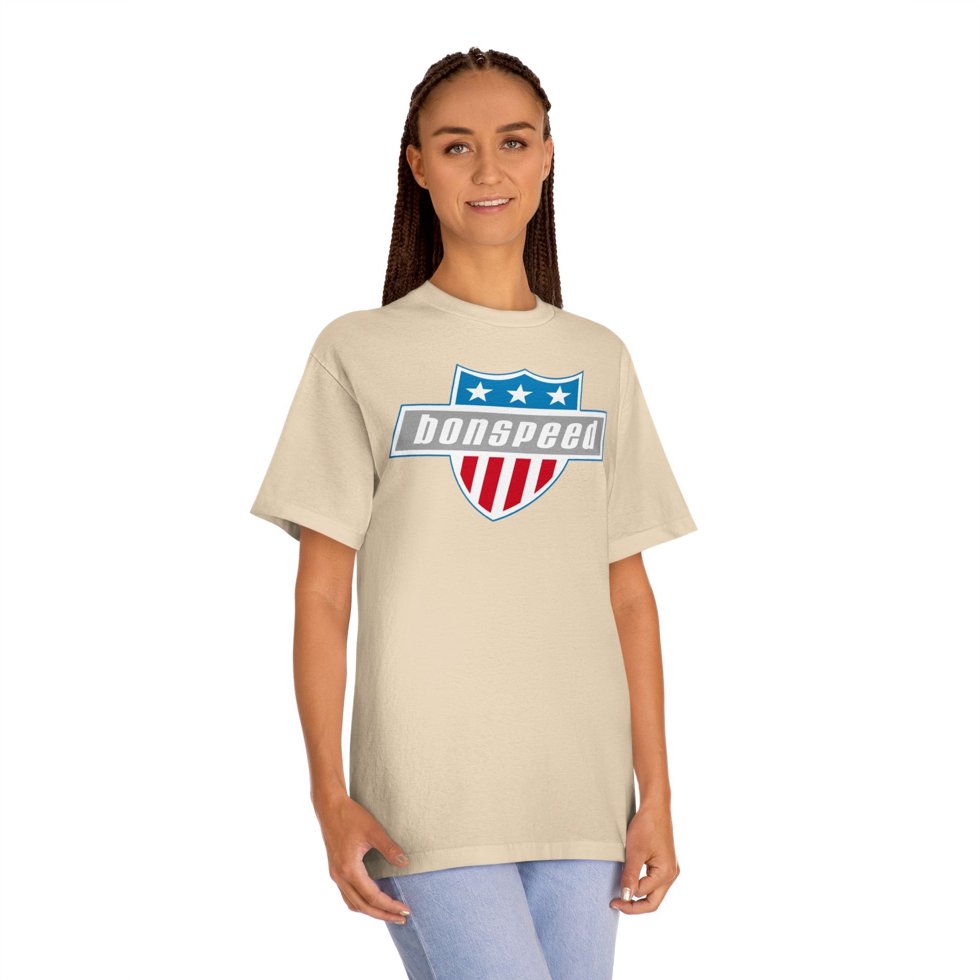 Show your pride and passion with the bonspeed American Shield Tee, featuring a bold red, white, and blue graphic that screams muscle cars and pure Americana. This design embodies the power, freedom, and performance spirit that defines bonspeed Street Wear.