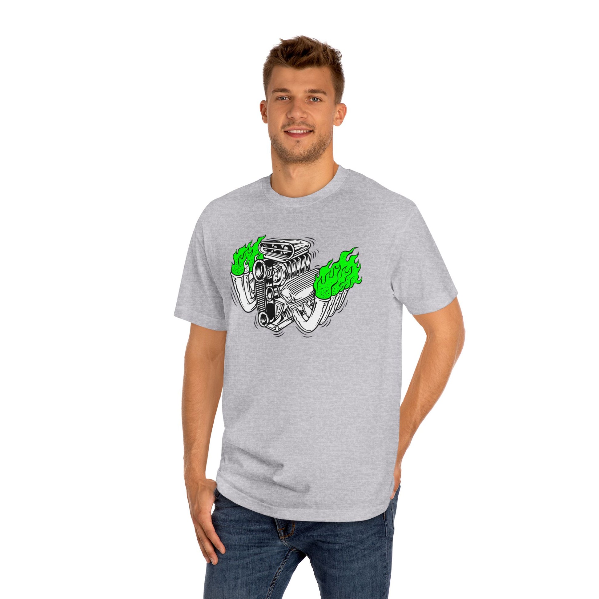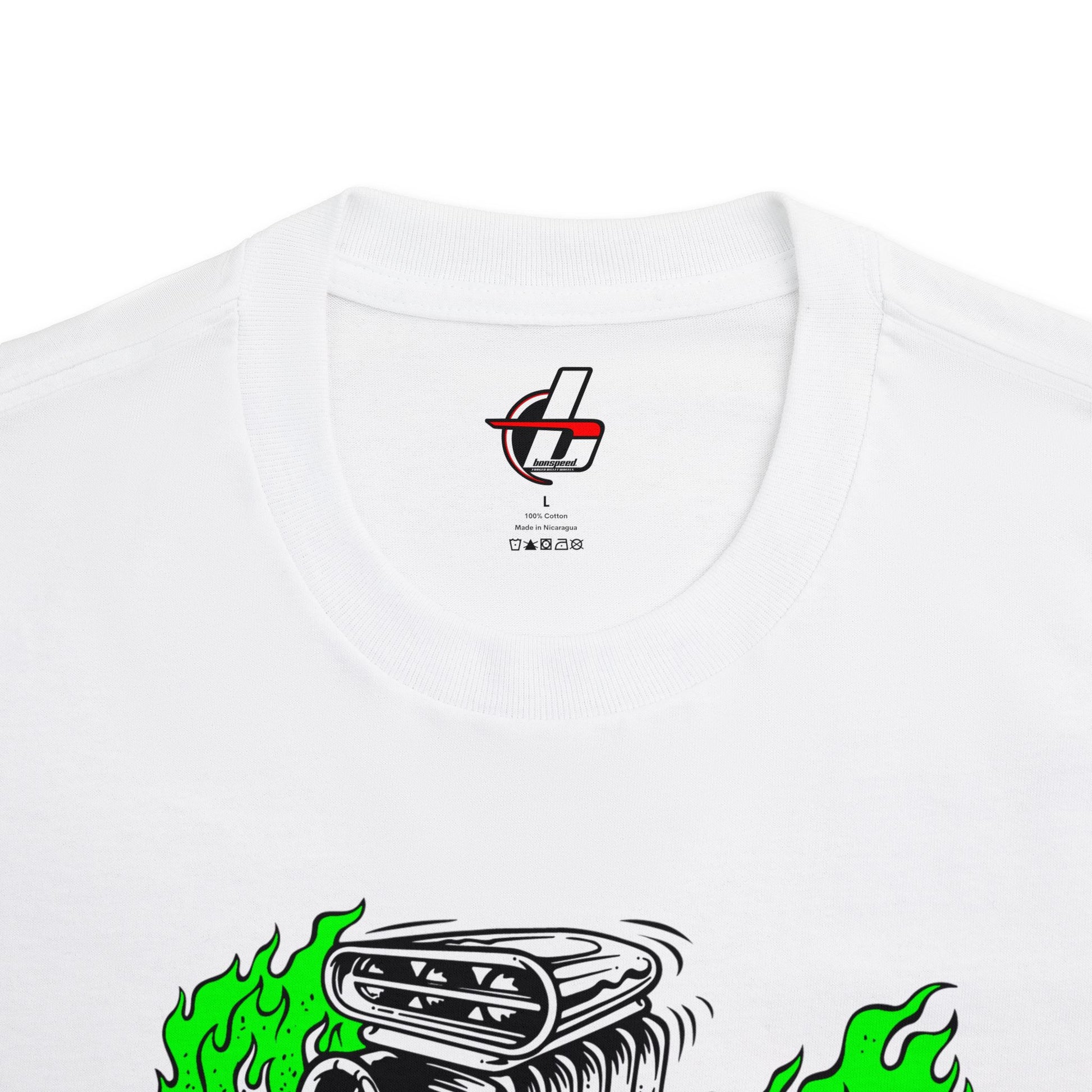 Get that Kustom look with a set of flames so loud and so green you will smile. This t-shirt has a vintage drag racing hot rod look and is printed on the chest.