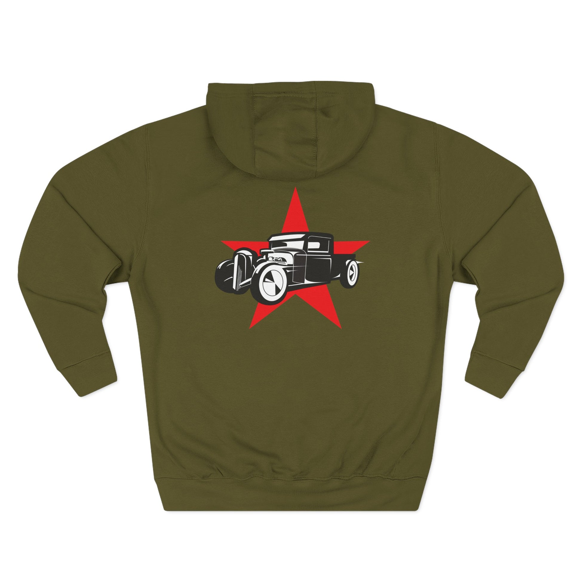 Step into retro-cool style with the Hot Rod Roadhouse Hoodie, featuring a striking back print of a rat-styled hot rod pickup set against a bold red star. This hoodie captures the rebellious energy of classic hot rod culture, a perfect blend of attitude, comfort, and timeless design.
